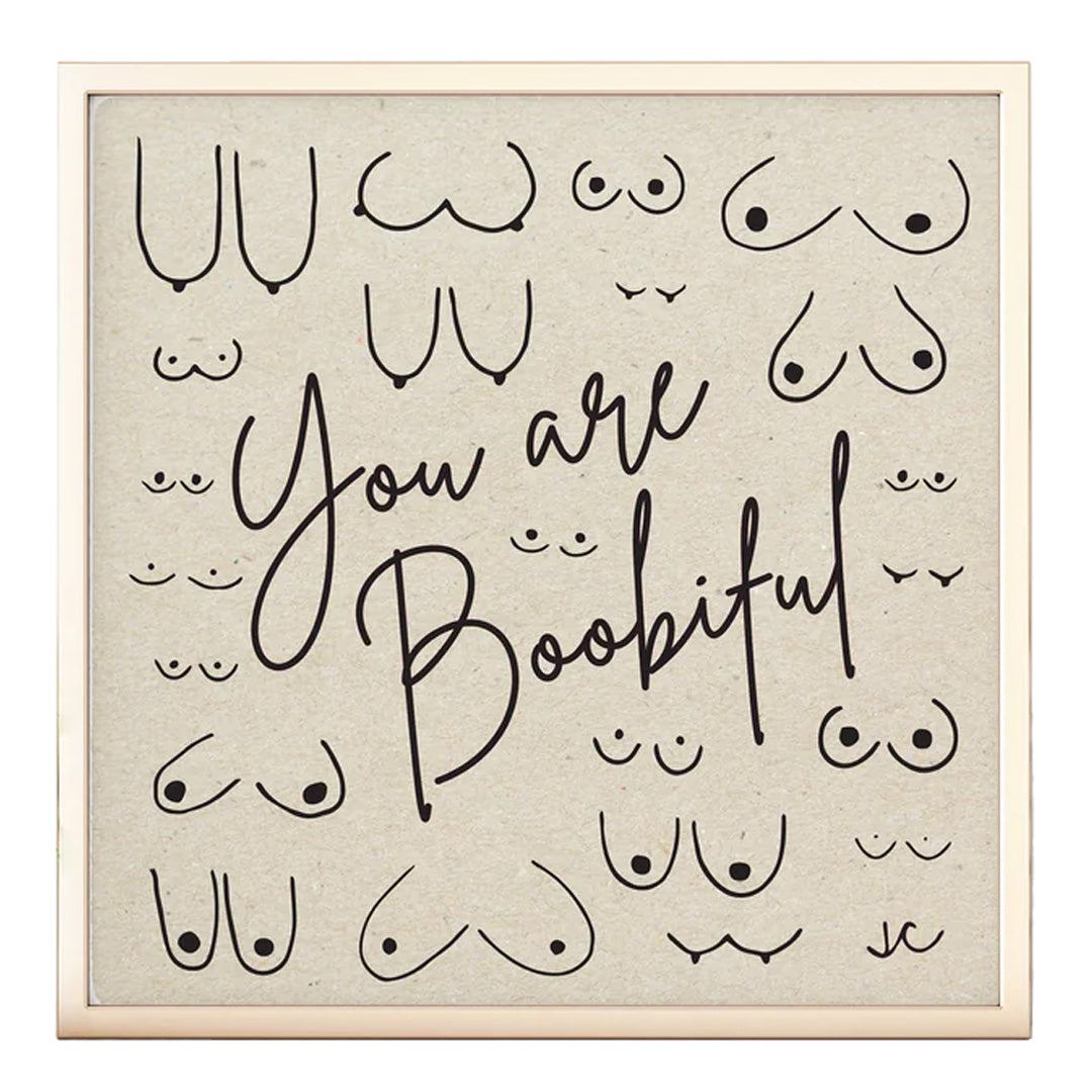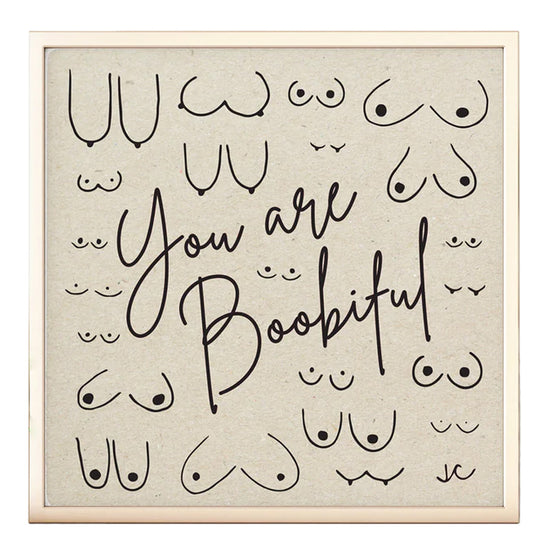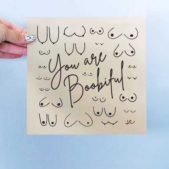 The "You are Boobiful" print is meant to promote body positivity by featuring a variety of Titties in different shapes and sizes with a message that is sure to bring a smile.